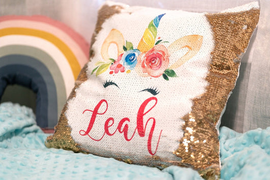 Her eyes will light up like a Christmas tree when she sees this personalized unicorn sequin pillow! What looks like a just a fancy gold pillow will soon reveal that it's a special gift made just for HER! This custom pillow will be the perfect finishing touch to her room! This gift is sure to be cherished for years to come!